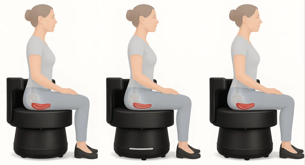 Du sitter fullt påklädd medan stolen skapar tusentals djupa muskelkontraktioner som du inte kan åstadkomma själv. Detta stärker bäckenbotten, core och stabilitet på ett säkert och effektivt sätt.